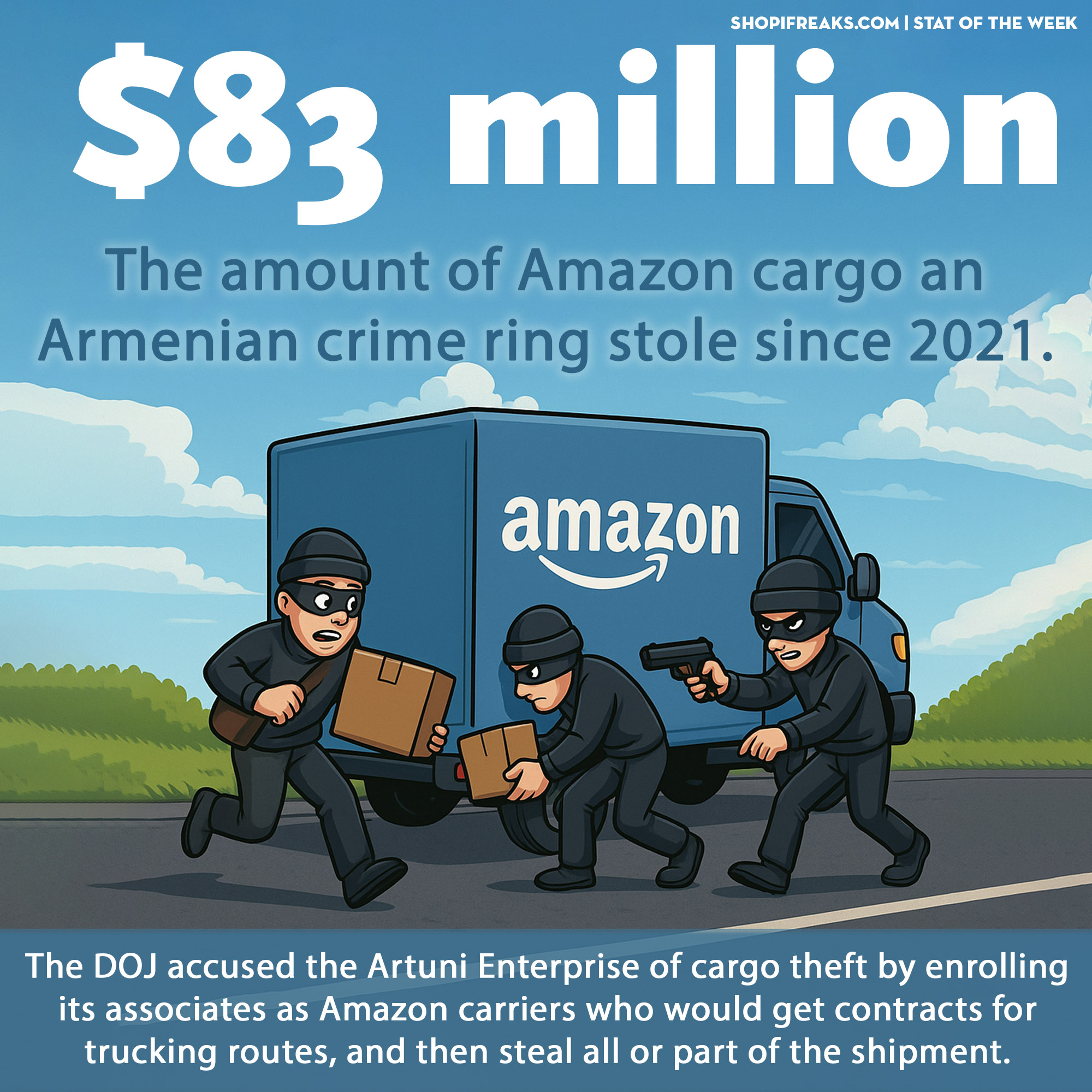 An Armenian crime ring stole $83M worth of Amazon cargo since 2021. The DOJ accused the Artuni Enterprise of cargo theft by enrolling its associates as Amazon carriers who would get contracts for trucking routes, and then steal all or part of the shipment. The organization also allegedly ran a “credit card bust-out” scheme, in which they would charge various credit cards to a sham business and then drain the checking account before the credit card companies could collect the soon-to-be disputed funds.